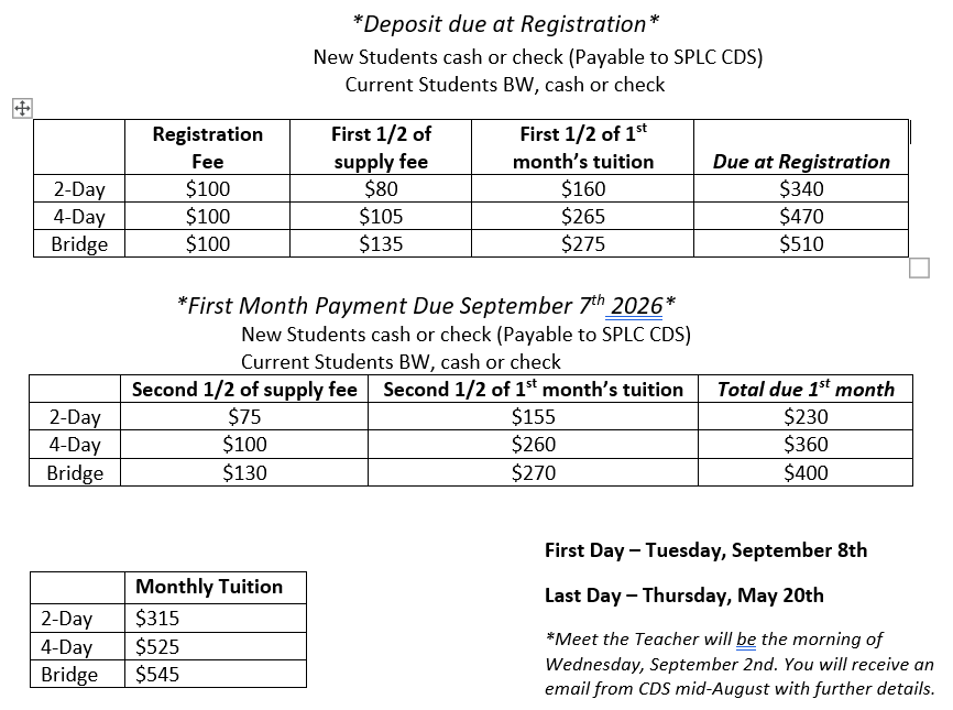 All enrollment fees listed below are non-refundable, due at registration, and can be paid by check (made out to SPLC CDS), cash, or Brightwheel (current students only). We are unable to accept credit cards.